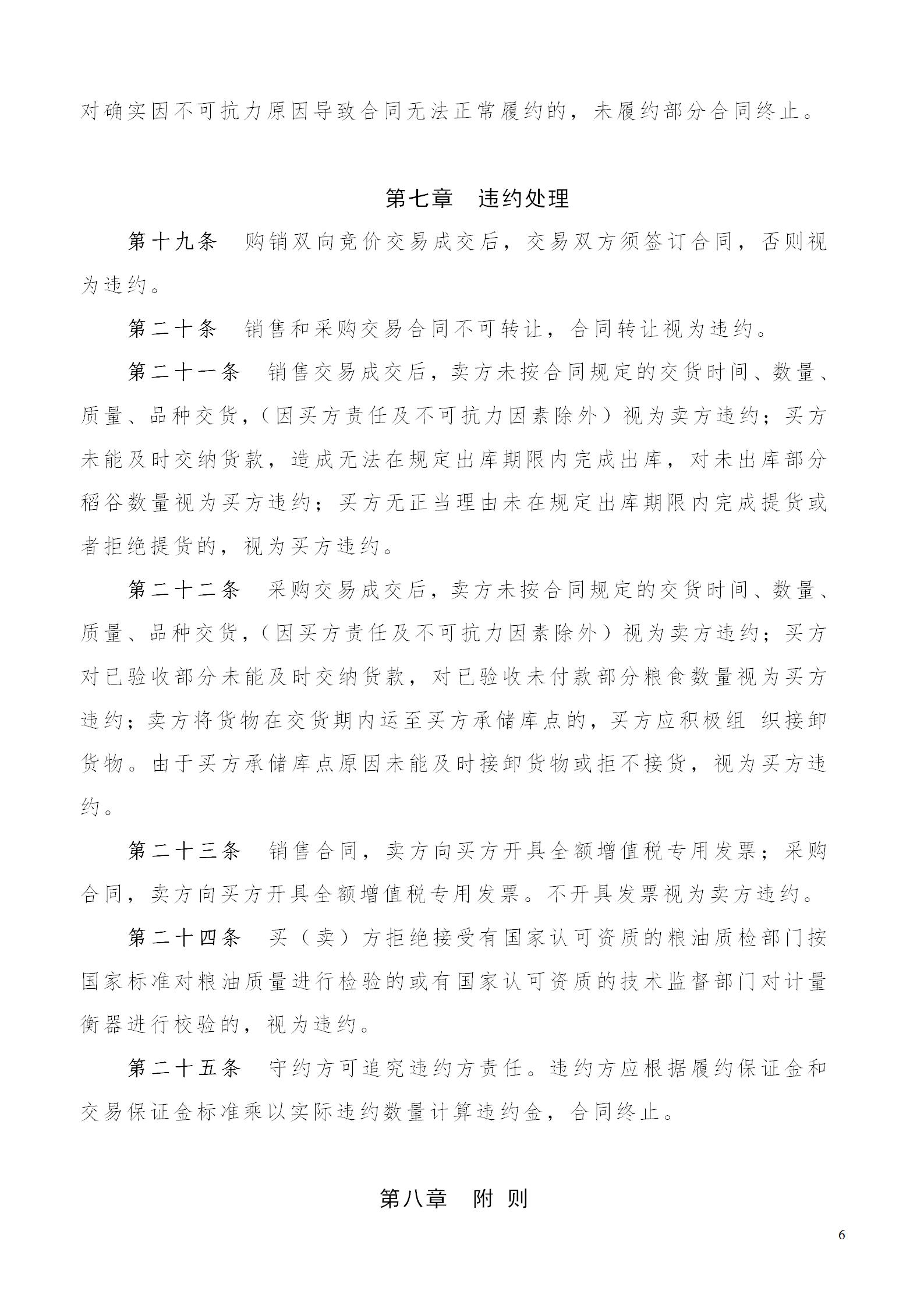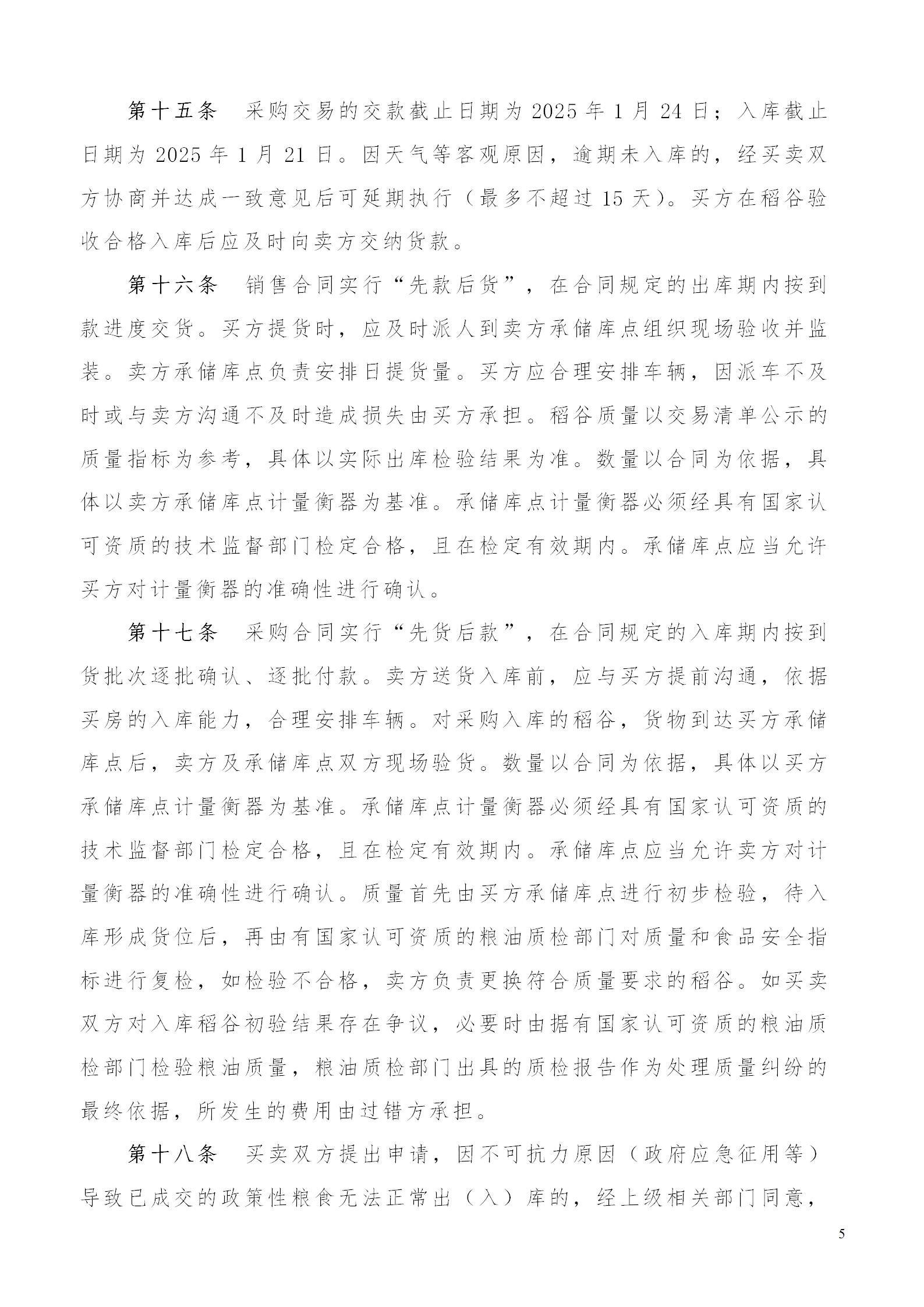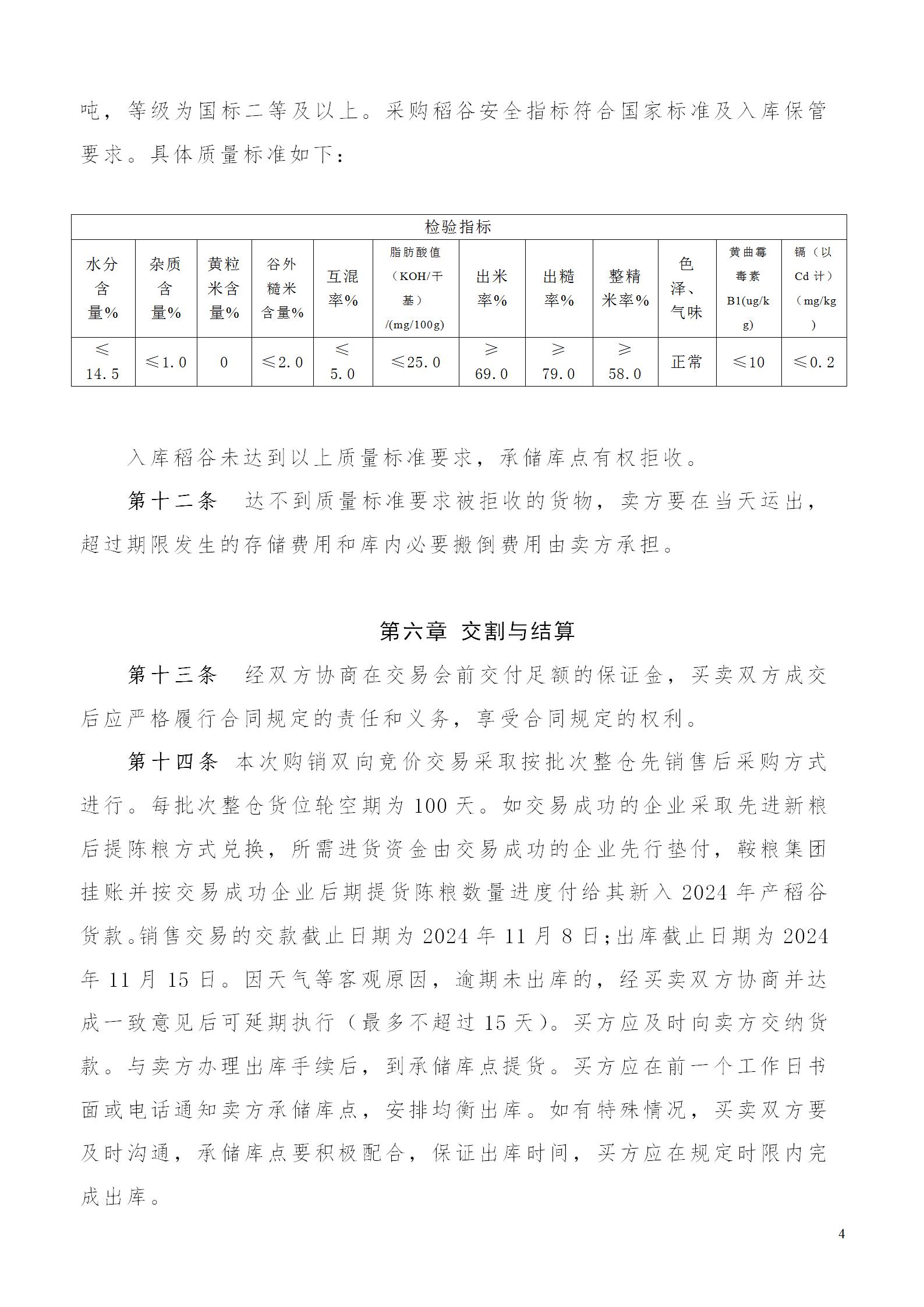 本次購銷雙向競價交易采取按批次整倉先銷售后采購方式進行。每批次整倉貨位輪空期為100天。如交易成功的企業(yè)采取先進新糧后提陳糧方式兌換,所需進貨資金由交易成功的企業(yè)先行墊付,鞍糧集團掛賬并按交易成功的企業(yè)后期提貨陳糧數(shù)量進度付給其新入2024年產(chǎn)稻谷貨款。銷售交易的交款截止日期為2024年11月8日;出庫截止日期為2024年11月15日;采購交易的交款截止日期為2025年1月24日;入庫截止日期為2025年1月21日。