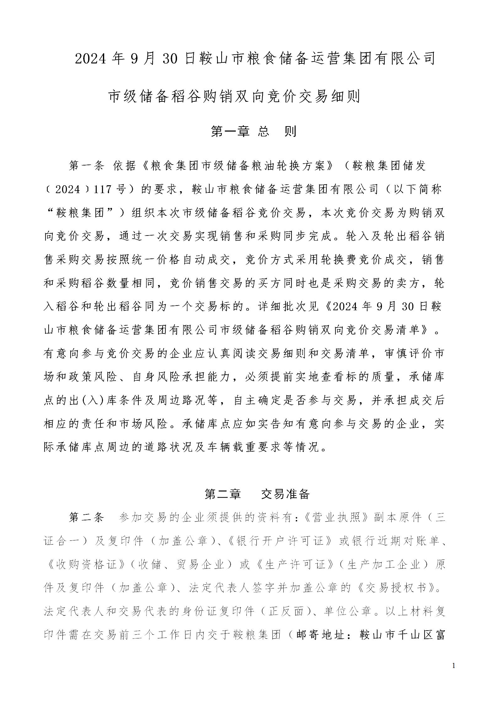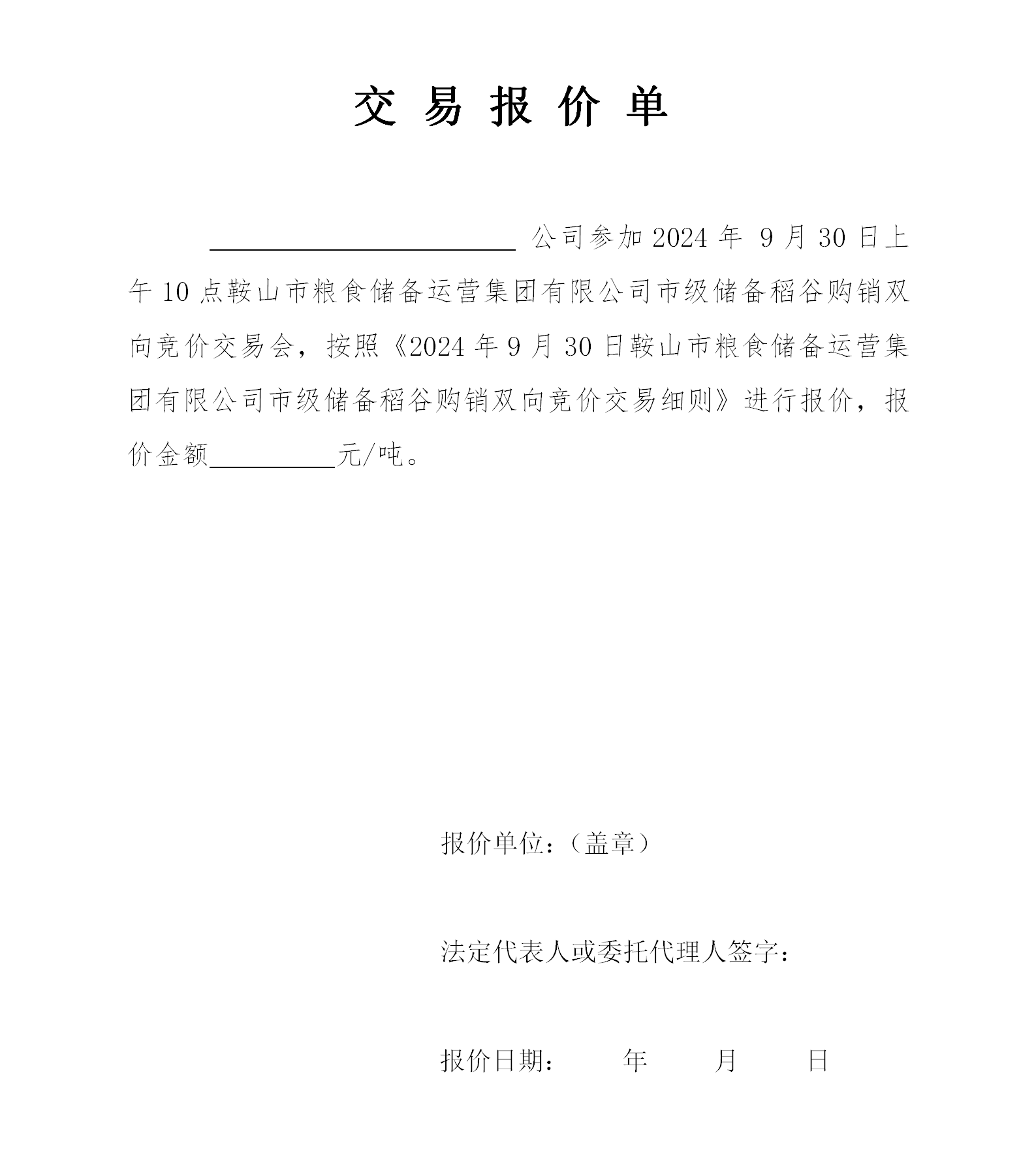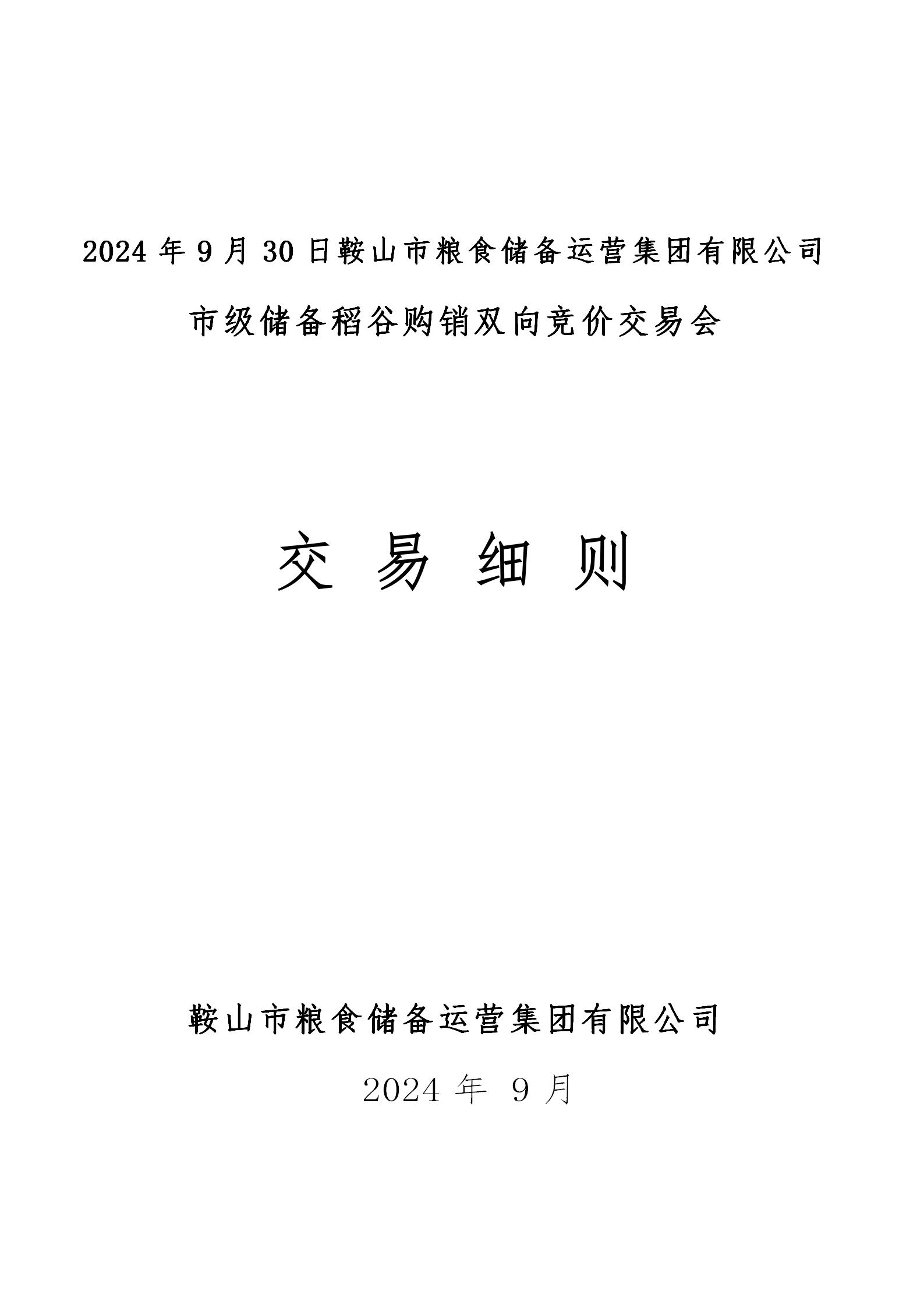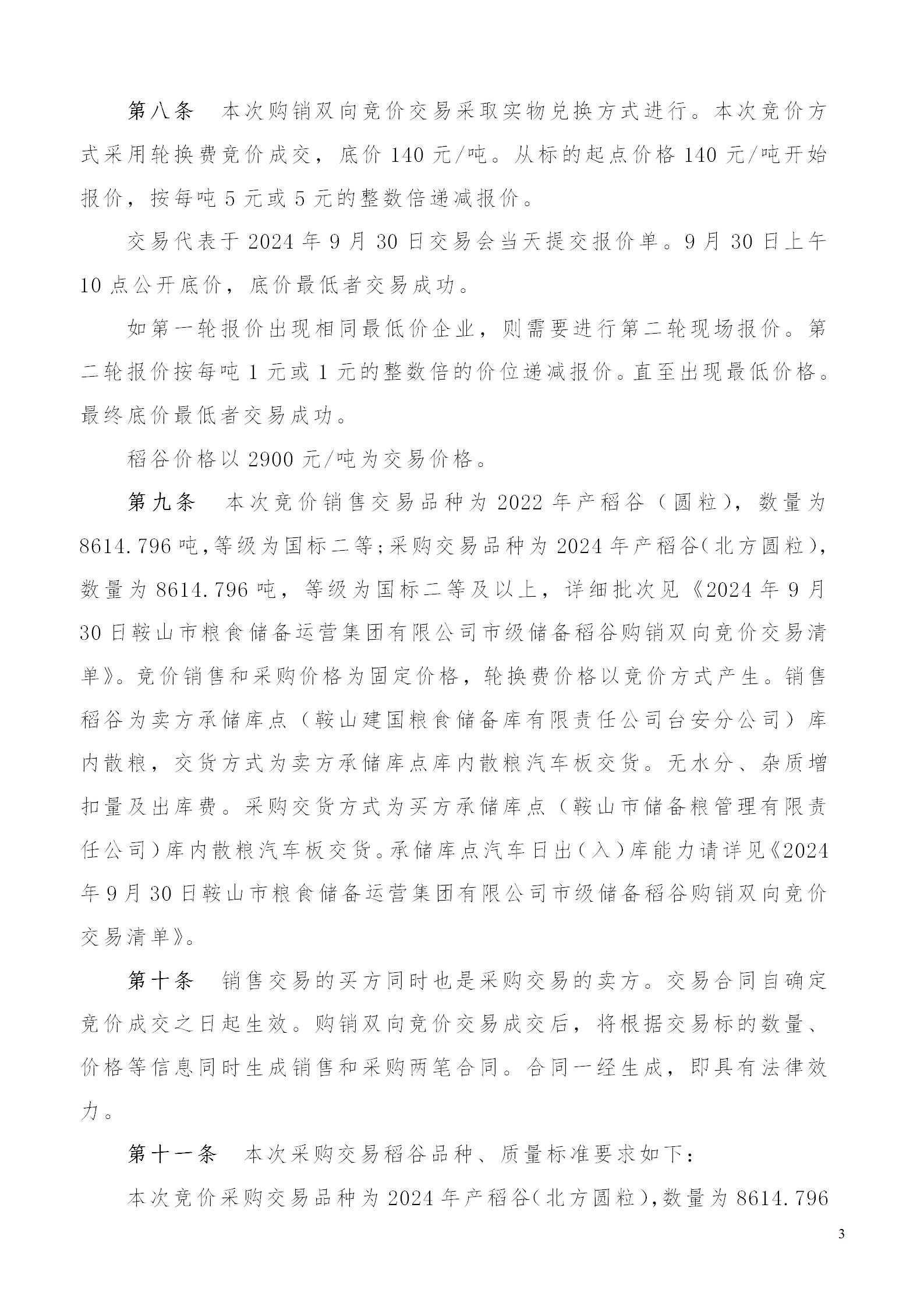 鞍山市糧食儲備運營集團有限公司(以下簡稱“鞍糧集團”)于2024年9月30日上午10點,舉辦“2024年9月30日鞍糧集團市級儲備稻谷購銷雙向競價交易會”,有關(guān)事宜公告如下: