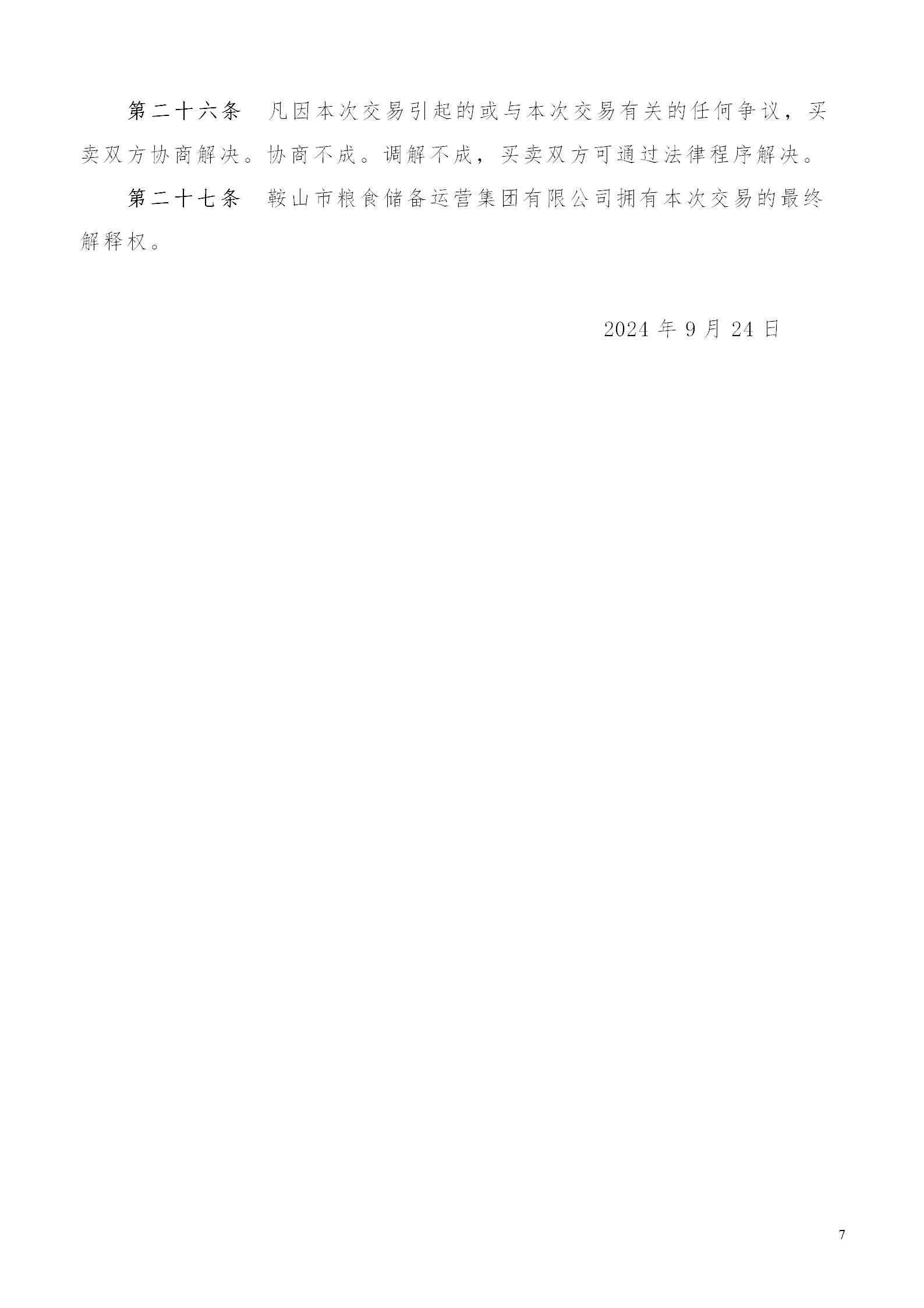 本次銷售交易品種為2022年產(chǎn)遼寧稻谷(圓粒),數(shù)量為8614.796噸,等級為國標二等,稻谷質(zhì)量以交易清單公示的質(zhì)量指標為參考,具體以實際出庫檢驗結(jié)果為準;采購交易品種為2024年產(chǎn)稻谷(北方圓粒),數(shù)量為8614.796噸,等級為國標二等及以上,詳細批次見《2024年9月30日鞍山市糧食儲備運營集團有限公司市級儲備稻谷購銷雙向競價交易清單》。入庫稻谷未達到質(zhì)量標準要求,承儲庫點有權(quán)拒收。銷售稻谷為賣方承儲庫點(鞍山建國糧食儲備庫有限責任公司臺安分公司)庫內(nèi)散糧,交貨方式為賣方承儲庫點庫內(nèi)散糧汽車板交貨。無水分、雜質(zhì)增扣量及出庫費。采購交貨方式為買方承儲庫點(鞍山市儲備糧管理有限責任公司)庫內(nèi)散糧汽車板交貨。交易相關(guān)規(guī)定具體詳見《2024年9月30日鞍山市糧食儲備運營集團有限公司市級儲備稻谷購銷雙向競價交易細則》。有意向參與競價交易的企業(yè)應(yīng)認真閱讀交易公告、交易細則和交易清單,審慎評價市場和政策風(fēng)險、自身風(fēng)險承擔能力,必須提前實地查看標的質(zhì)量,承儲庫點的出(入)庫條件及周邊路況等,自主確定是否參與交易,并承擔成交后相應(yīng)的責任和市場風(fēng)險。承儲庫點應(yīng)如實告知有意向參與交易的企業(yè),實際承儲庫點周邊的道路狀況及車輛載重要求等情況。