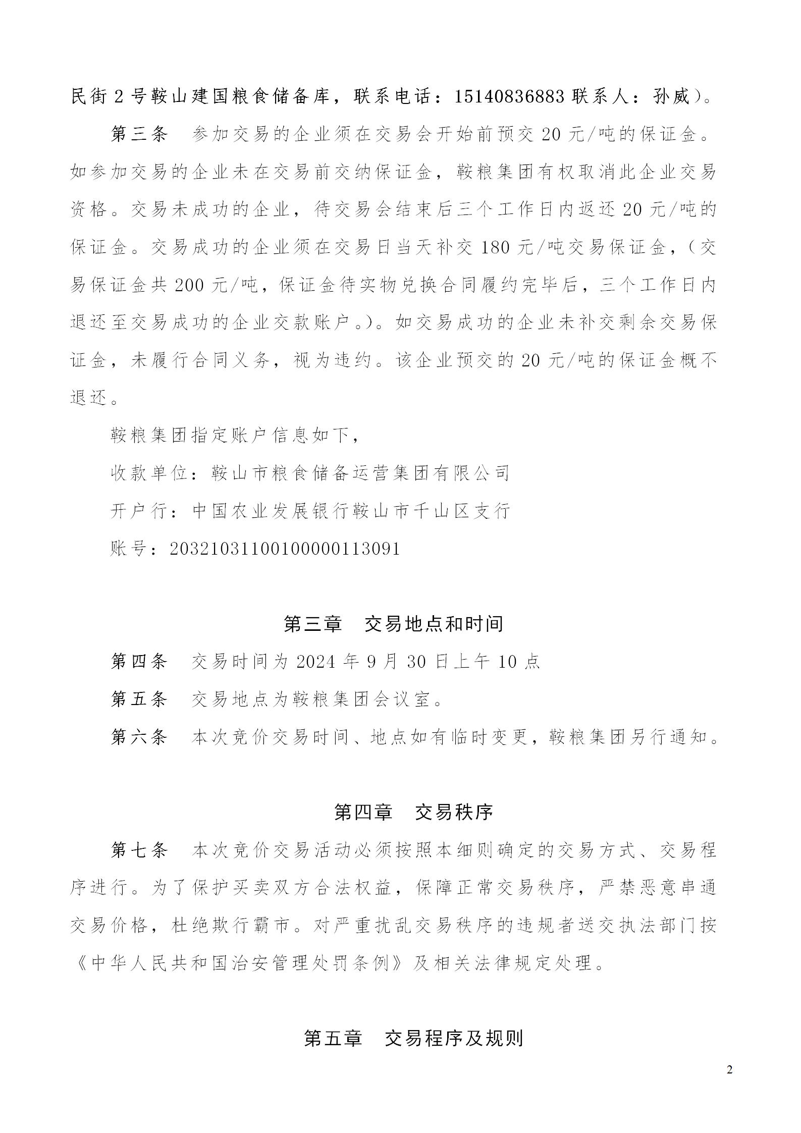 本次購銷雙向競價交易時間為2024年9月30日上午10點。參加交易的企業(yè)須在交易會開始前預(yù)交20元/噸的保證金。如參加交易的企業(yè)未在交易前交納保證金,鞍糧集團有權(quán)取消此企業(yè)交易資格。交易未成功的企業(yè),待交易會結(jié)束后三個工作日內(nèi)返還20元/噸的保證金。交易成功的企業(yè)須在交易日當天補交180元/噸交易保證金(交易保證金共200元/噸,保證金待實物兌換合同履約完畢后,三個工作日內(nèi)退還至交易成功的企業(yè)交款賬戶)。如交易成功的企業(yè)未補交剩余交易保證金,未履行合同義務(wù),視為違約。該企業(yè)預(yù)交的20元/噸的保證金概不退還。鞍糧集團指定賬戶信息如下:
