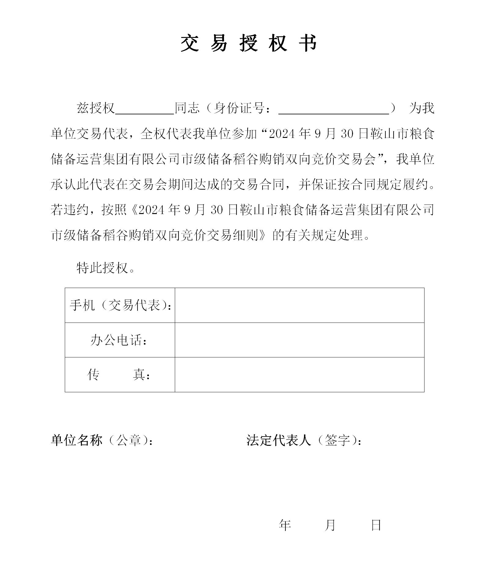 本次競價交易為購銷雙向競價交易,通過一次交易實現(xiàn)銷售和采購?fù)酵瓿桑c單向的競價銷售或競價采購不同。輪入及輪出稻谷銷售采購交易按照同一價格自動成交,競價方式采用輪換費競價成交,稻谷銷售和采購數(shù)量相同,競價銷售交易的買方同時也是采購交易的賣方,輪入稻谷和輪出稻谷同為一個交易標的。參加交易的企業(yè)須提供的資料有:《營業(yè)執(zhí)照》副本原件(三證合一)及復(fù)印件(加蓋公章)、《銀行開戶許可證》或銀行近期對賬單、《收購資格證》(收儲、貿(mào)易企業(yè))或《生產(chǎn)許可證》(生產(chǎn)加工企業(yè))原件及復(fù)印件(加蓋公章)、法定代表人簽字并加蓋公章的《交易授權(quán)書》。法定代表人和交易代表的身份證復(fù)印件(正反面)、單位公章。以上材料復(fù)印件需在交易會前三天交于鞍糧集團(郵寄地址:鞍山市千山區(qū)富民街2號鞍山建國糧食儲備庫,聯(lián)系電話:15140836883聯(lián)系人:孫威)。